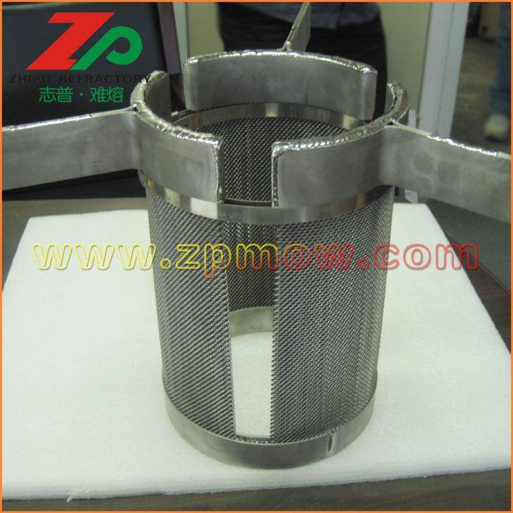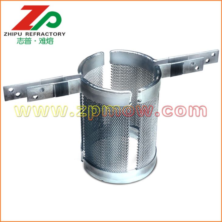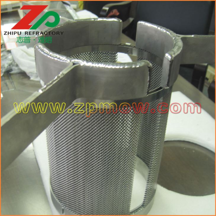 發(fā)熱體一般采用鳥籠結(jié)構(gòu)鎢發(fā)熱體或者鎢絲網(wǎng)發(fā)熱體,有利于提供均勻穩(wěn)定的溫場。 鎢絲網(wǎng)發(fā)熱體組件做為藍寶石晶體生長爐內(nèi)的熱源,對鎢坩堝內(nèi)的熔液形成湍流、產(chǎn)生徑向溫度梯度具有決定性的作用。因此,具有高純度、高密度、制作精良、設計合理的鎢絲網(wǎng)發(fā)熱體組件對藍寶石晶體的質(zhì)量控制,節(jié)約能源以及使用壽命具有重要意義。